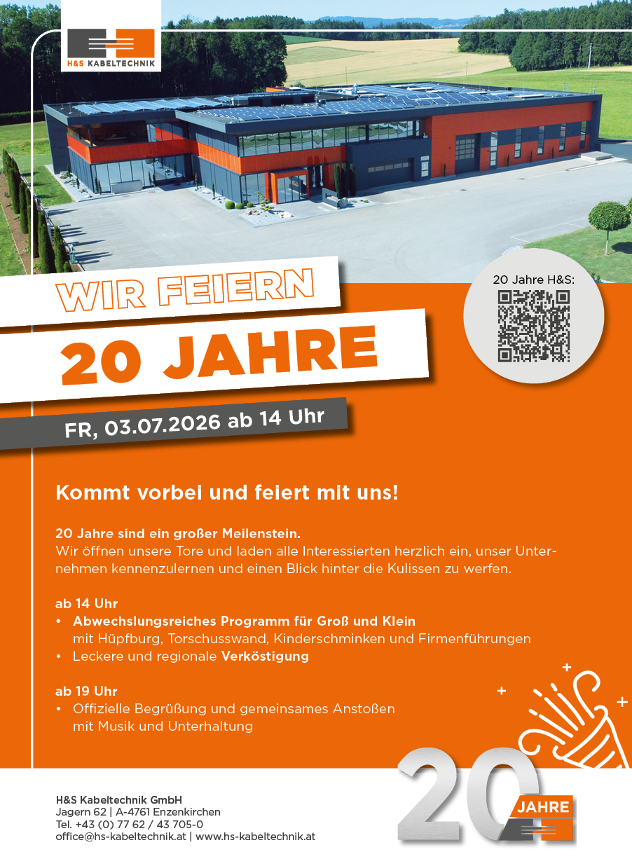 Anlässlich unseres 20-jährigen Jubiläums öffnen wir unsere Türen und laden alle herzlich ein, unser Unternehmen kennenzulernen und einen Blick hinter die Kulissen zu werfen. Neben Firmenführungen erwartet unsere Besucherinnen und Besucher ein unterhaltsames, abwechslungsreiches Programm – und auch für das leibliche Wohl ist bestens gesorgt.